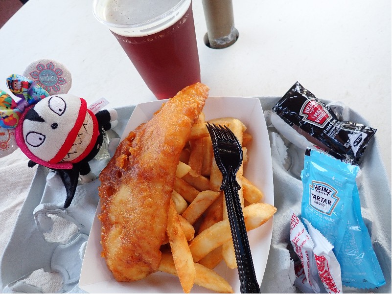 | ルミナス前に腹ごしらえ、、、EPT1周して、やっぱコレ フィッシュ&チップス Beer battered Fish & Chips $13.49、Bombardier Amber United Kingdom $11.25、Total $26.35.- なお、レジ並びが凄いことになっていたので、その横でモバイル・オーダーする、、便利じゃわ〜 | ||