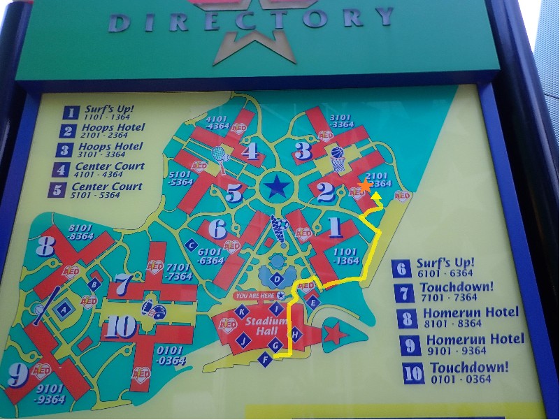 | 昨夜にも載せたこの地図はこの時撮ったモノ、バス停からはショップ横の通路を抜けて駐車場側の遊歩道を歩けば部屋まで直ぐ ホテルの部屋番号地図を作ろうと思いつき、写真を撮りに散策 帰国後 作成した(→オールスターの部屋番号地図がコチラ) いつか作ろう作ろうと思ってたのよ、コレでon−line check inしてメールで届く部屋の位置が大体わかる | ||