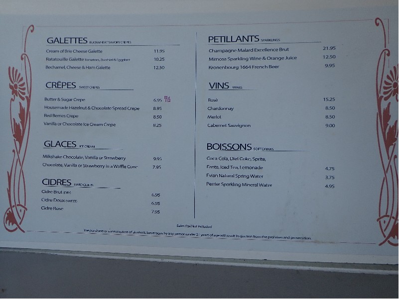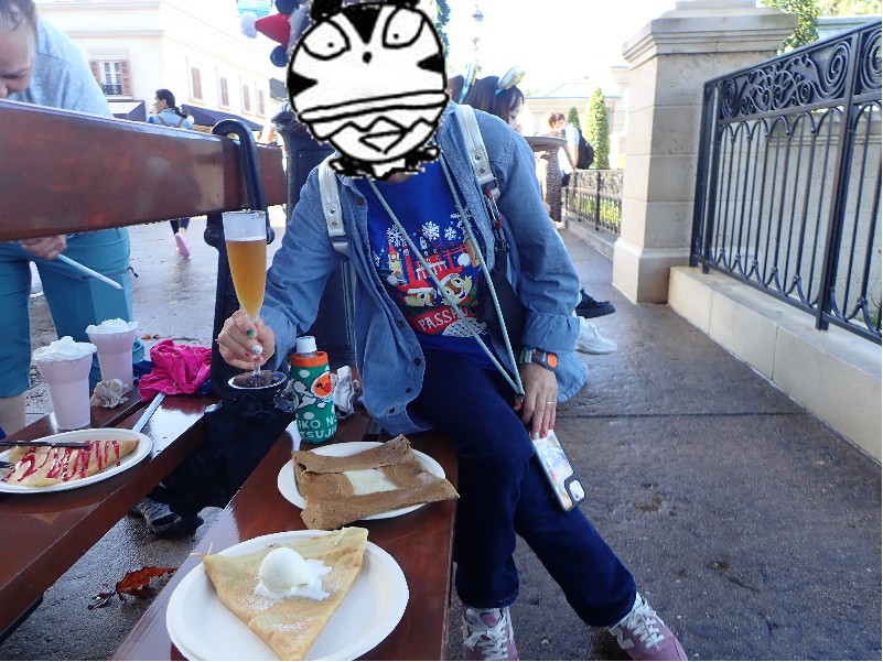 | テーブルサービスの方だとチップが必要 味は同じだし、禍々しいチップは払いたくない(単なるケチ) なので外のクイックサービスで充分・・・ただね、外のクイックサービスだと席無い ベンチで食すしかないのが難点かな。。でも皆さんベンチで食しておる 味は。。。至って普通だが、WDWではまぁ美味しい部類(爆 ベシャメルソースのガレットは美味しかった シードルが飲めたのも嬉しかったかな ちなみにパリよりニューカレドニアの離島で食べたガレットが今まで食べたなかで一押し (→2013.7.4 パリでガレット) (→2014.1.28 カナール島でガレット) |