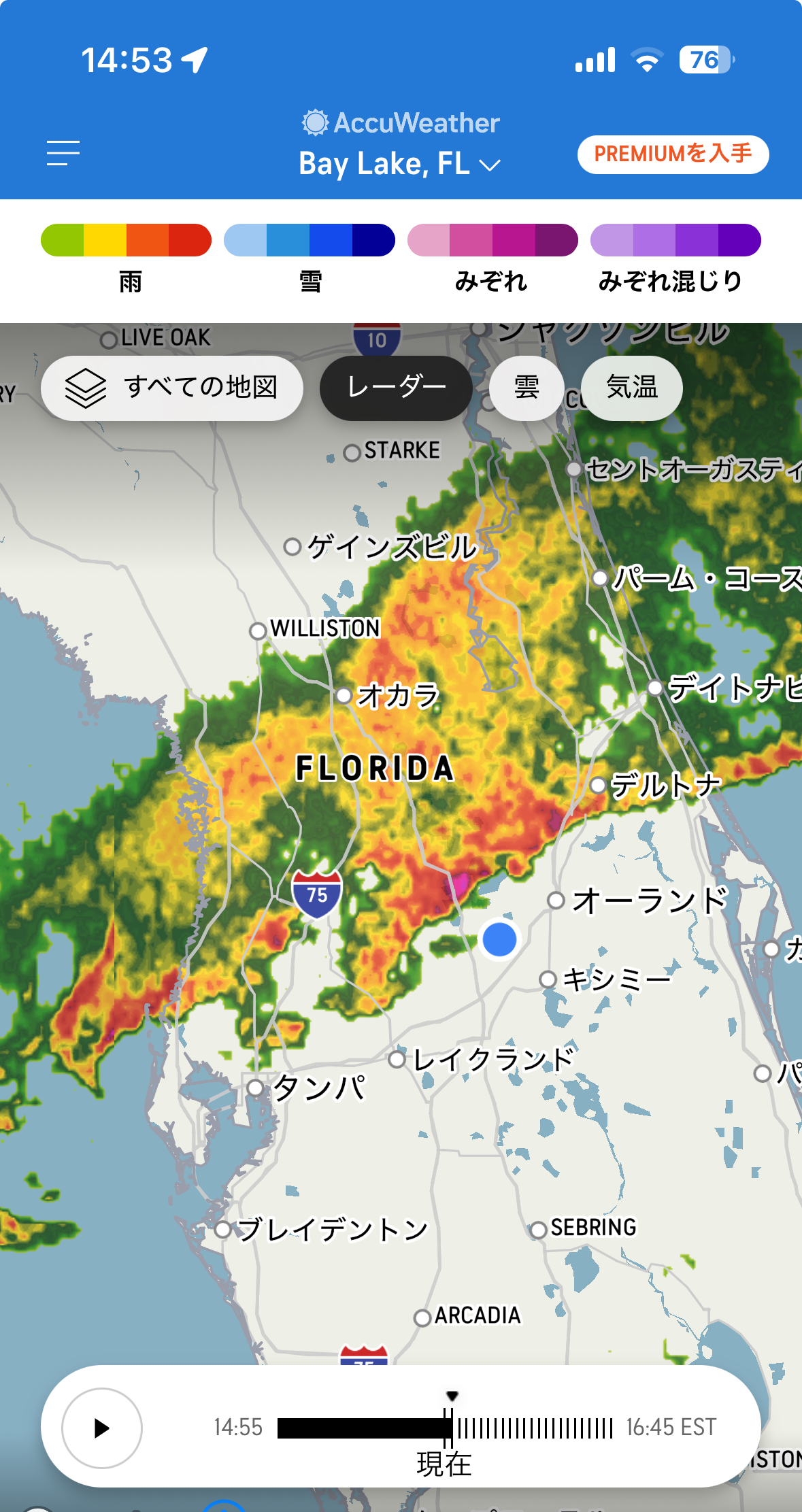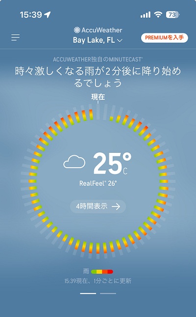 | 15:26 アウト 15:39 部屋到着。。。Accuweatherで確認すると・・・ヒャ〜〜〜危なかった〜ギリセーフ | ||