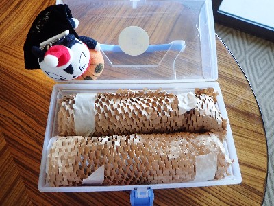 | Treasure号の処女航海でいただいたシャンパングラスだが、 箱も何もなくプチプチも忘れたので、どうやって日本に持って帰ろうか難儀していたが 他で買い物した時に貰った緩衝剤で包み、来るときにボールドの洗剤等を入れてきたケースが空いたので 入れてみると・・・まさかのシンデレラフィット 100均のケースは万能じゃ |