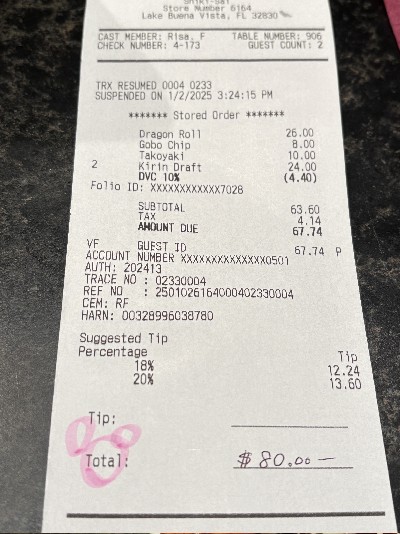 | DVC割引効きます、チップ込みで$80のお支払 当時の円相場は@¥160を超えて カードの支払いが¥164で来て仰天した思い出 ざっと¥13,000 だが、めちゃめちゃ美味しかった〜〜ので許す 久々にWDWで美味しい物に有りつけたわ お雑煮は明日リベンジしよう(明日は予約が取れておる) |