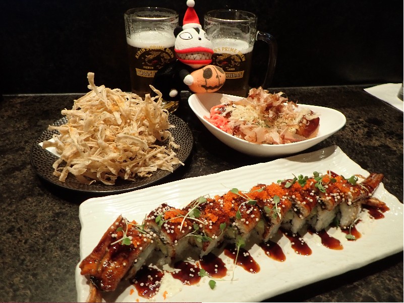| 手前からドラゴンロール、海老天とアボカド、キュウリの巻き寿司にウナギとトビコが乗った豪華仕立て $26 奥右、タコ焼き $10、左 ごぼうチップ $8、 (2025.9.ごぼうチップはメニューから消えとりました) 目の雨で調理してくれるのでアレも食いたい、コレも食いたい!と頼んでたら、お腹いっぱいになってしまった |